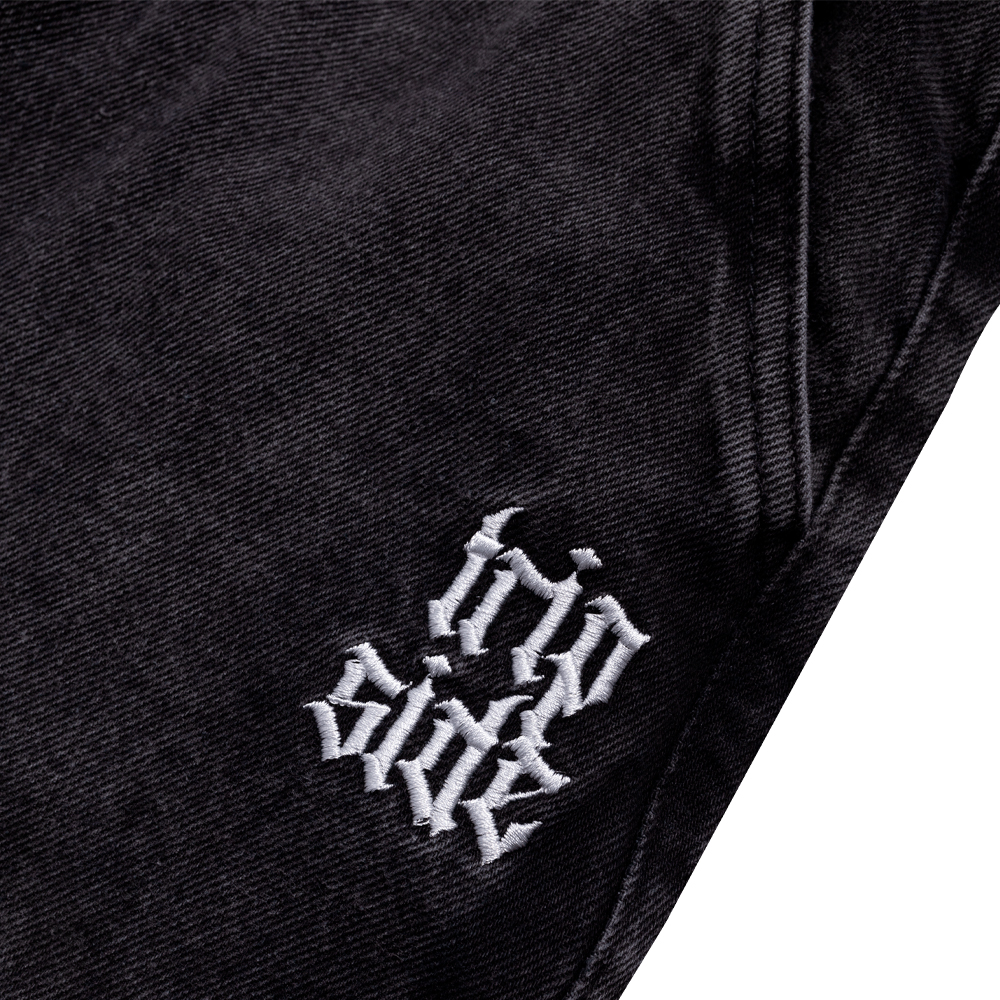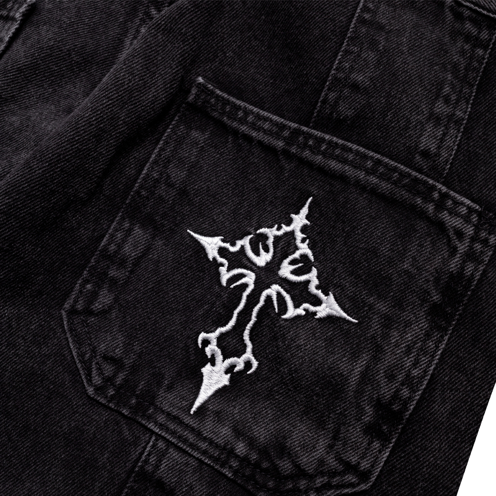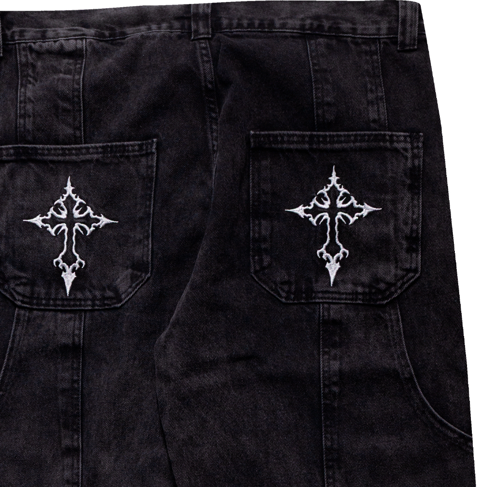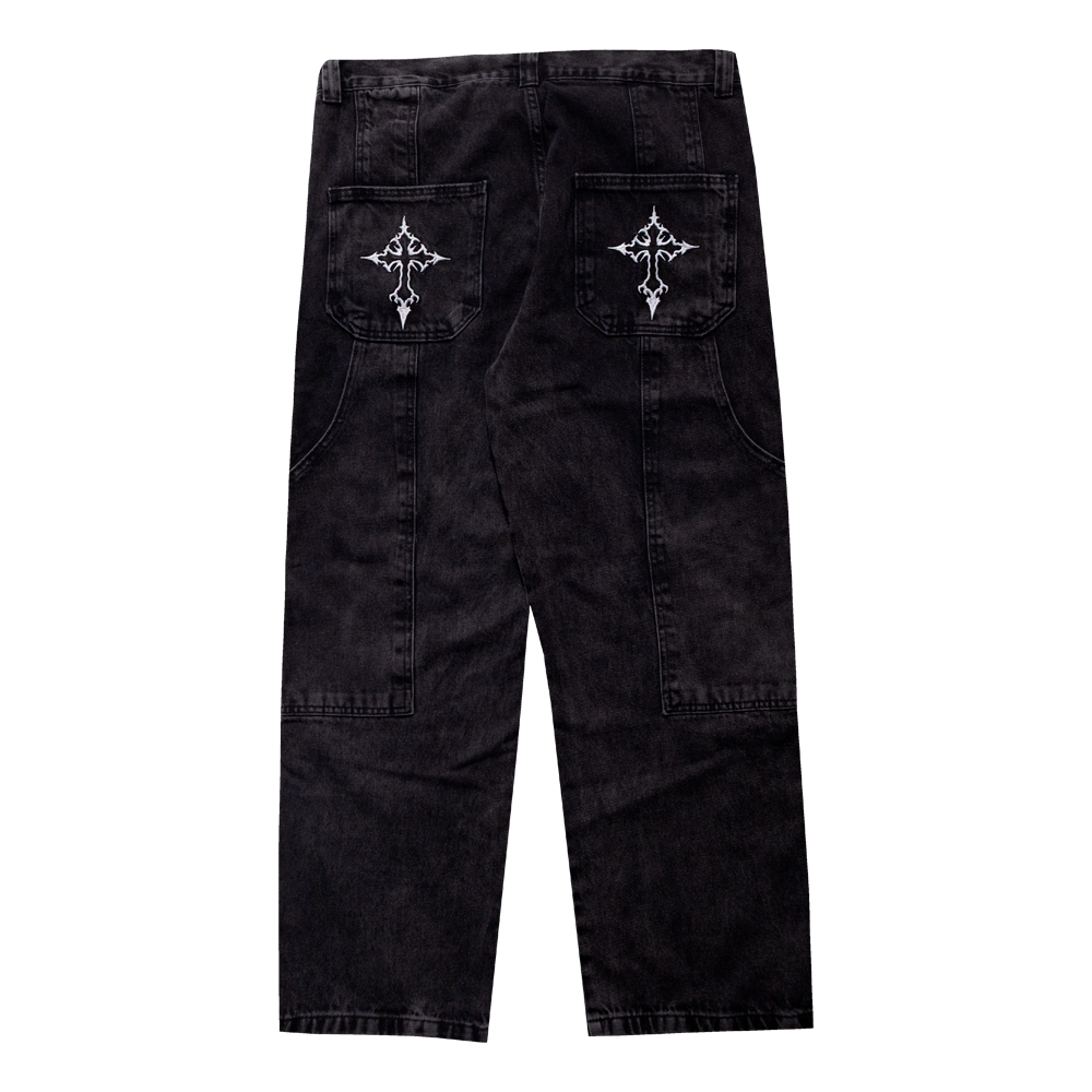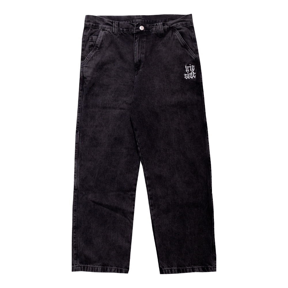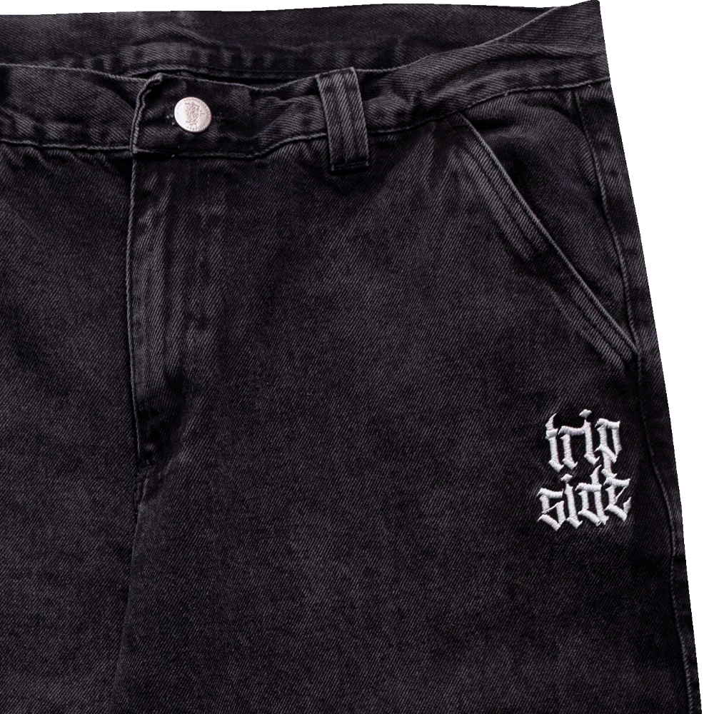 Calça Trip Side baggy jeans estonada com cruz e detalhe duplo carpinteiro. Estilo streetwear autêntico, confortável e resistente.